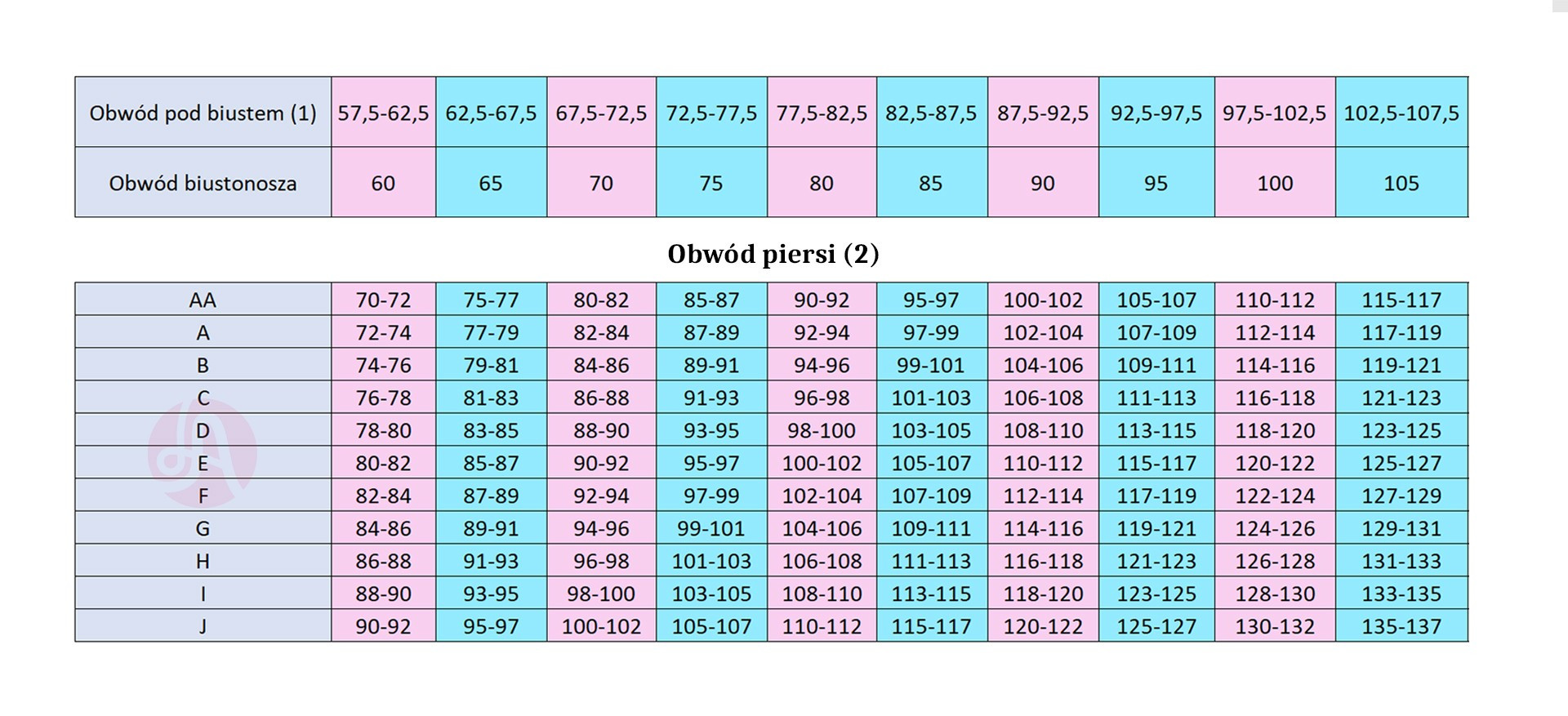 Zmierz obwód pod biustem zaczynając od mostka, przyłóż centymetr dookoła klatki piersiowej i lekko napnij (bez nadmiernego ucisku). Wynik zaokrąglasz w dół, do liczby będącej wielokrotnością piątki, np. przy 92 cm Twój rozmiar pod biustem to 90. Jeśli natomiast masz w obwodzie 74 cm, Twój idealny rozmiar to 75 cm.