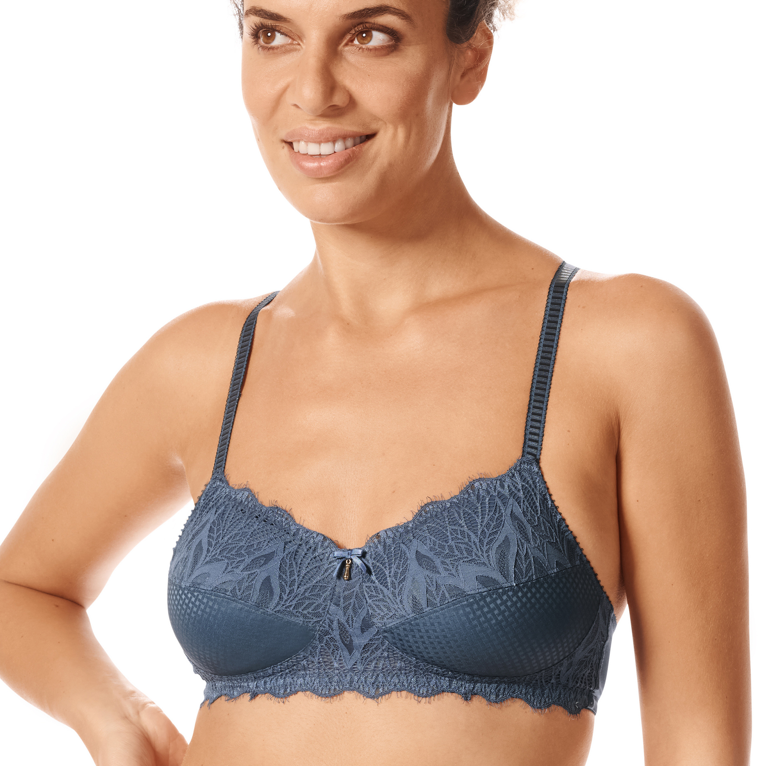 Biustonosz bez fiszbin Alessia SB łączy w sobie elegancką koronkę, elastyczną satynę z wzorem oraz miękką mikrofibrę, tworząc spójny i luksusowy wygląd. Posiada obustronne kieszonki do protez piersi.