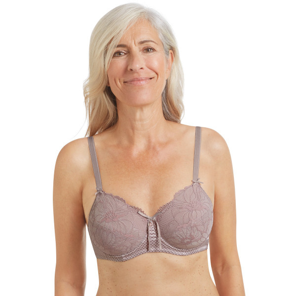 Biustonosz po mastektomii Amoena Be Amazing to doskonałe połączenie elegancji i funkcjonalności, zaprojektowane z myślą o kobietach po operacji. Model Be Amazing wyróżnia się subtelną kolorystyką w odcieniach szaro-różowych oraz bogatą, delikatną koronką z kwiatowym wzorem, która zdobi górną część miseczki i dekolt. Dodatkowym atutem jest regulowany przód, ozdobiony satynową kokardką, który pozwala na dopasowanie głębokości dekoltu lub dyskretne ukrycie blizn. Biustonosz wykonany jest z lśniącej mikrofibry, która zapewnia komfort noszenia, a kieszenie na protezę wykonane z oddychającego materiału regulującego temperaturę dbają o wygodę przez cały dzień. Regulowane, elastyczne ramiączka oraz miękko wyściełane fiszbiny boczne gwarantują idealne dopasowanie i dodatkowe wsparcie.