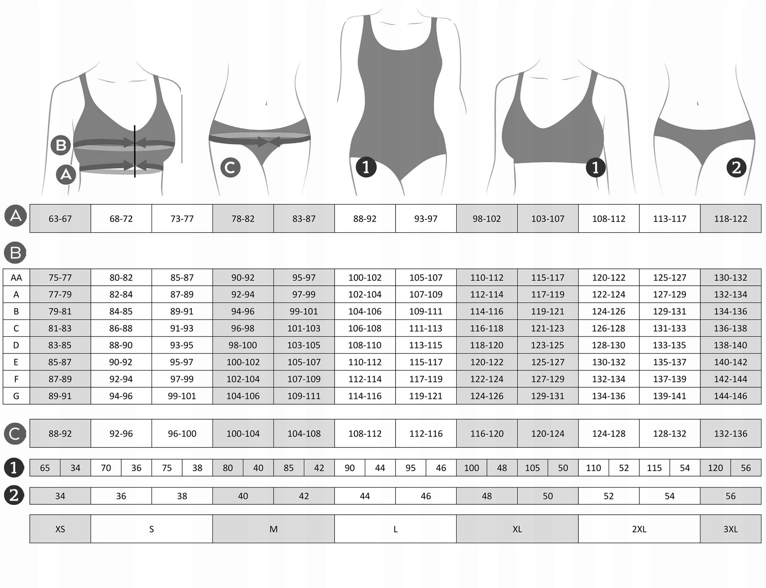 Zmierz obwód pod biustem zaczynając od mostka, przyłóż centymetr dookoła klatki piersiowej i lekko napnij (bez nadmiernego ucisku). Wynik zaokrąglasz w dół, do liczby będącej wielokrotnością piątki, np. przy 92 cm Twój rozmiar pod biustem to 90. Jeśli natomiast masz w obwodzie 74 cm, Twój idealny rozmiar to 75 cm.