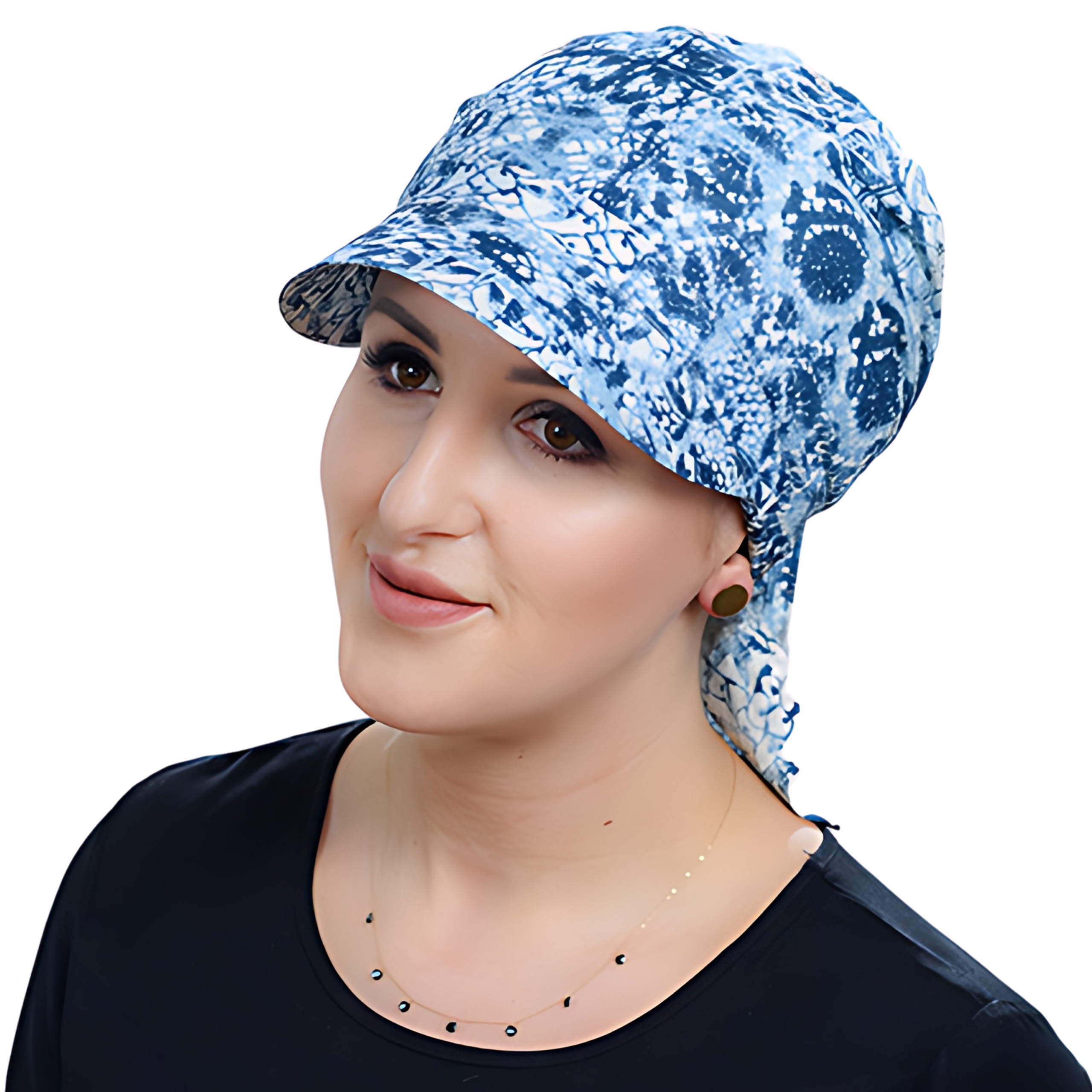 Chusta na głowę wiązana z daszkiem Kaja to doskonały wybór dla osób szukających skutecznej ochrony przed słońcem. Świetnie sprawdza się jako praktyczne rozwiązanie po utracie włosów, a jednocześnie jako stylowy element garderoby.