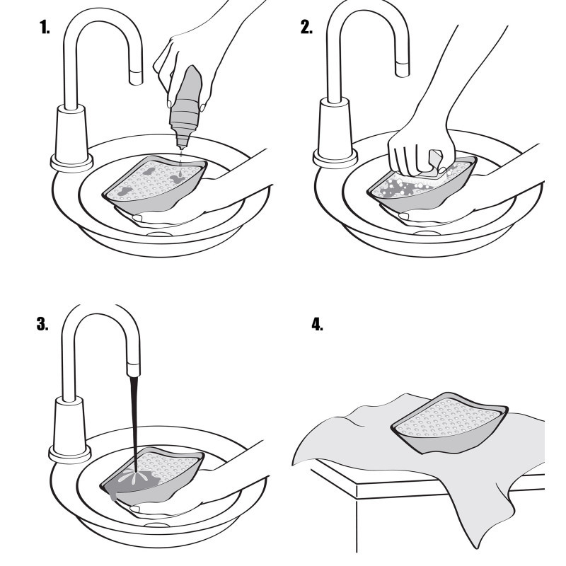 - Płyn efektywnie czyści protezy piersi i silikonowe plastry, przygotowując je do ponownego użytkowania