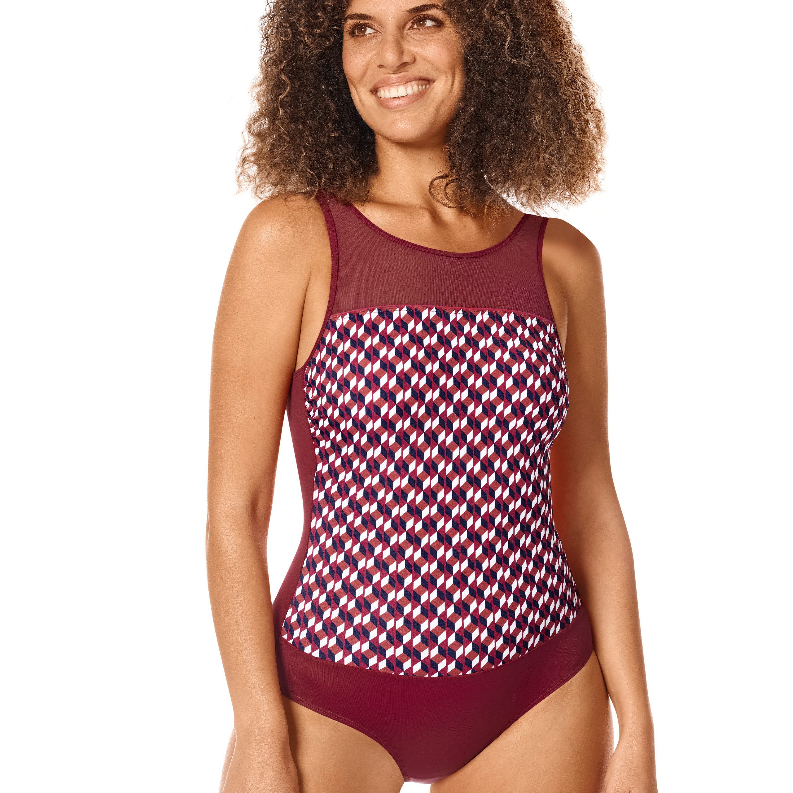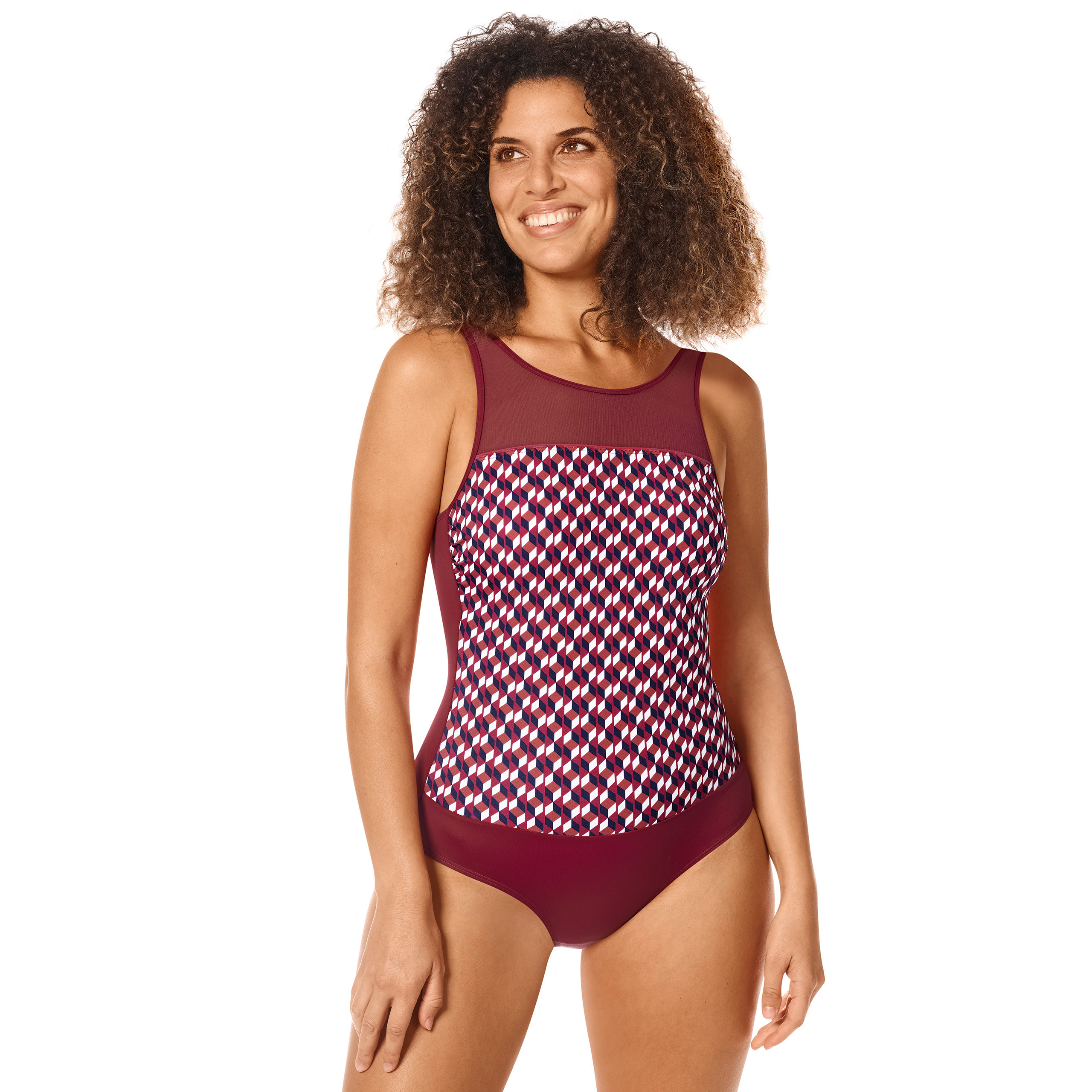 Jednoczęściowy kostium kąpielowy, styl retro w bogatych odcieniach burgundu. Strój zapewnia doskonałą ochronę wrażliwej skóry i blizn przed promieniowaniem UV 50+.